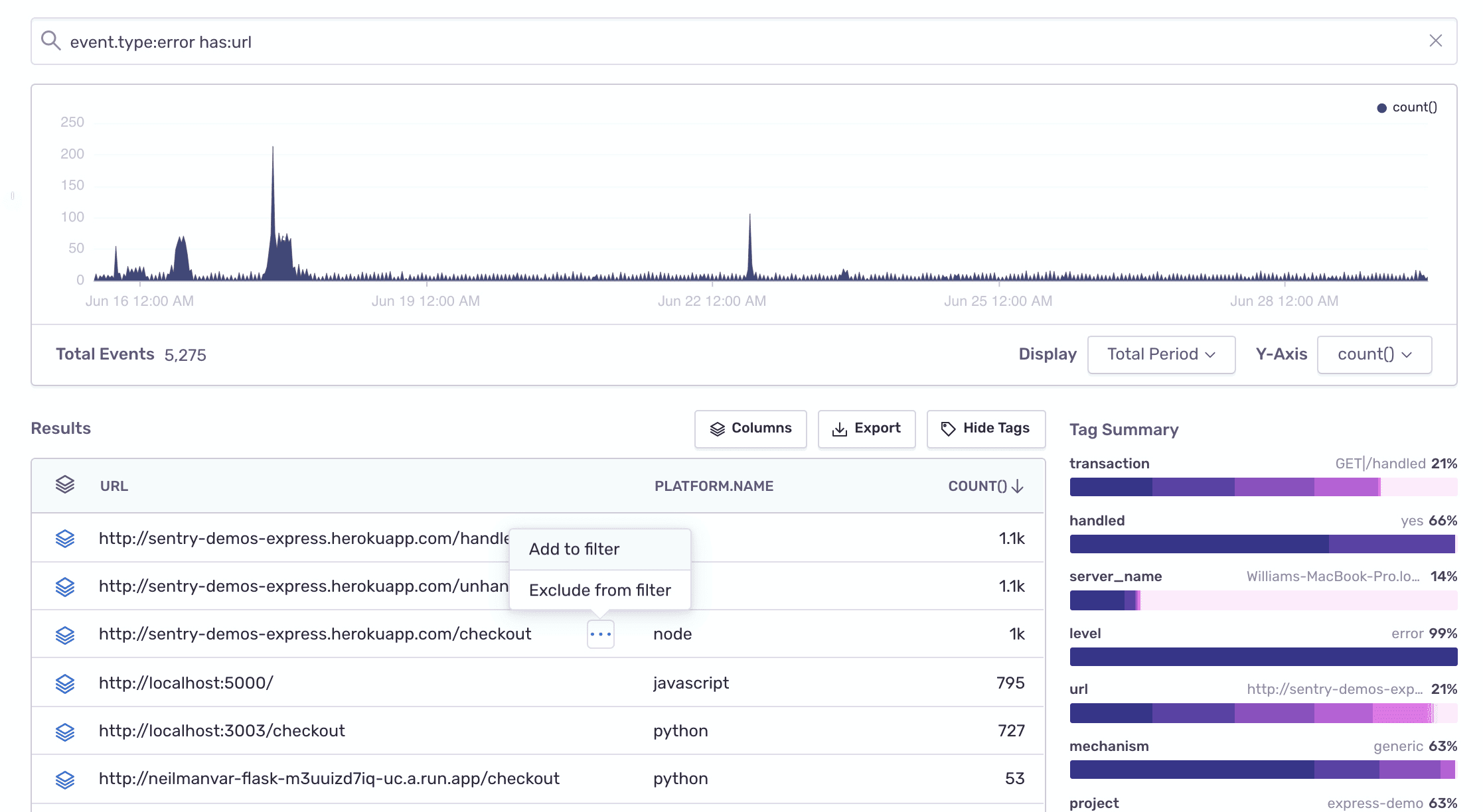 Sentry notifies you in real-time when your application breaks, and then provides the information and tools to triage and resolve the error. With Discover, you can take a more proactive approach to find the major issues that break your apps. Building that query might look like this: